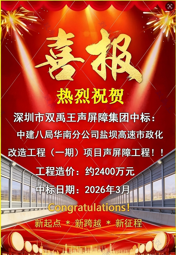 2026年3月,深圳市双禹王声屏障工程技术有限公司在云筑网平台成功中标中建八局华南分公司盐坝高速市政化改造工程(一期)声屏障工程,中标金额2400万元。